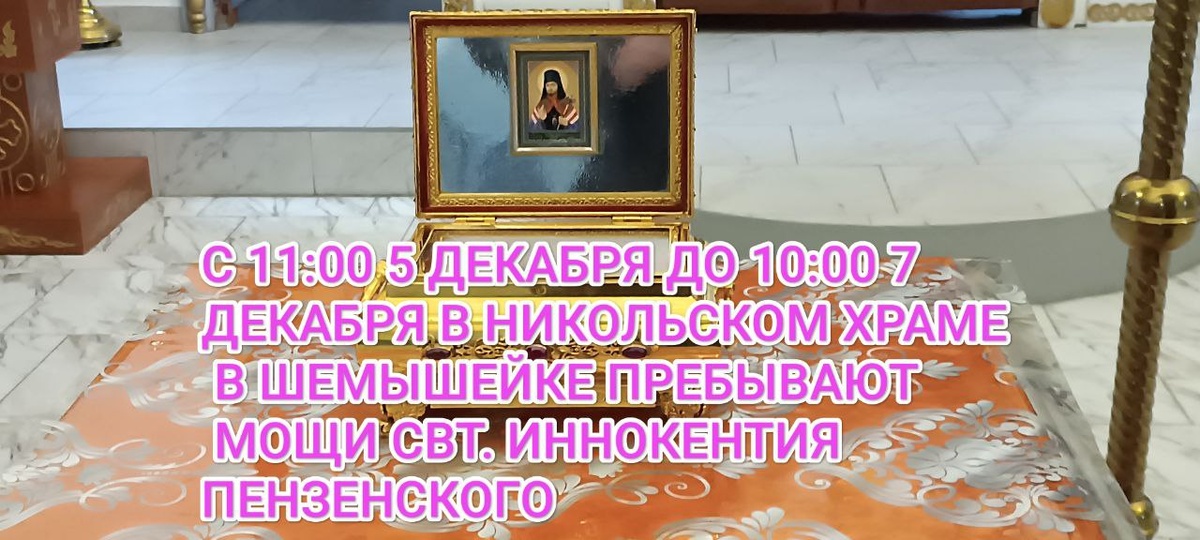 С 11:00 5 декабря 2025 г.(пятница) по 10:00 7 декабря 2025 г. в храме Святителя Николая Чудотворца в р. п. Шемышейка находятся мощи святителя Иннокентия Пензенского. Расписание молебнов с акафистом: 5 декабря в 11:00 6 декабря в 10:00 6 декабря в 15:15 7 декабря в 9:30