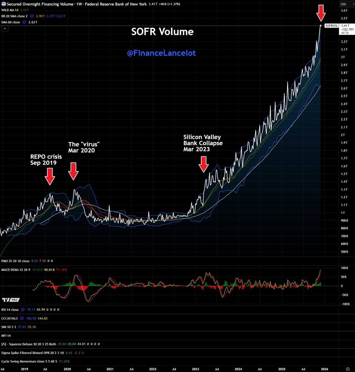 Когда система начинает дышать чаще Есть графики, которые не про цену. Не про свечи. Они про дыхание системы. И когда я смотрю на SOFR — объём overnight-финансирования — я вижу именно дыхание. Пульс долларовой архитектуры. Пульс, который в последние месяцы стал чаще, громче и, честно говоря, напряжённее. Каждый крупный всплеск этой метрики говорил одно и то же: рынок внезапно нуждается в мгновенной ликвидности. Не завтра. Не через аукцион. А здесь и сейчас. Мы это уже проходили. Репо-кризис 2019. Ковид-паника 2020. Крах Silicon Valley Bank в 2023. И вот — новый вертикальный взлёт. Самый крупный в истории SOFR. Он не кричит. Он просто показывает, что система снова становится жёсткой, как перегретый металл. QT, высокие ставки, отток ликвидности — всё это сжимает пружину, и банки начинают тянуть доллар через аварийный канал overnight-финансирования. В здоровой системе так не бывает. Это всегда ранний маркер стресса. И здесь интереснее всего связь с нашим текущим циклом. Мы с вами уж