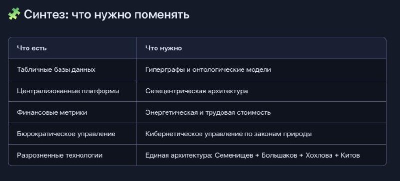 🔗 Что можно сделать Хочешь, я соберу архитектурную карту новой цифровой экономики, где объединю: Семенищева (стоимость), Большакова (мощность), Хохлову (гиперграф), Китова (кибернетику), Trinitas (онтологию Жизни). Это будет схема, которую можно использовать как основу для цифровой платформы будущего.