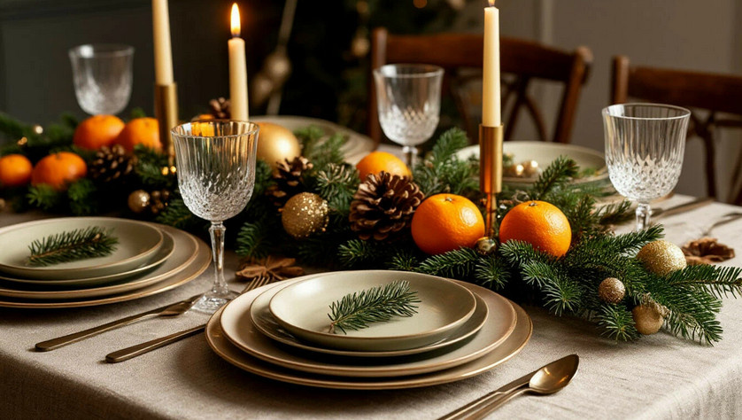 Первое впечатление создает скатерть или дорожка. Именно она задает тон. Откажитесь от ярких синтетических тканей с кричащими новогодними рисунками. Выбирайте натуральные материалы и сдержанные цвета.