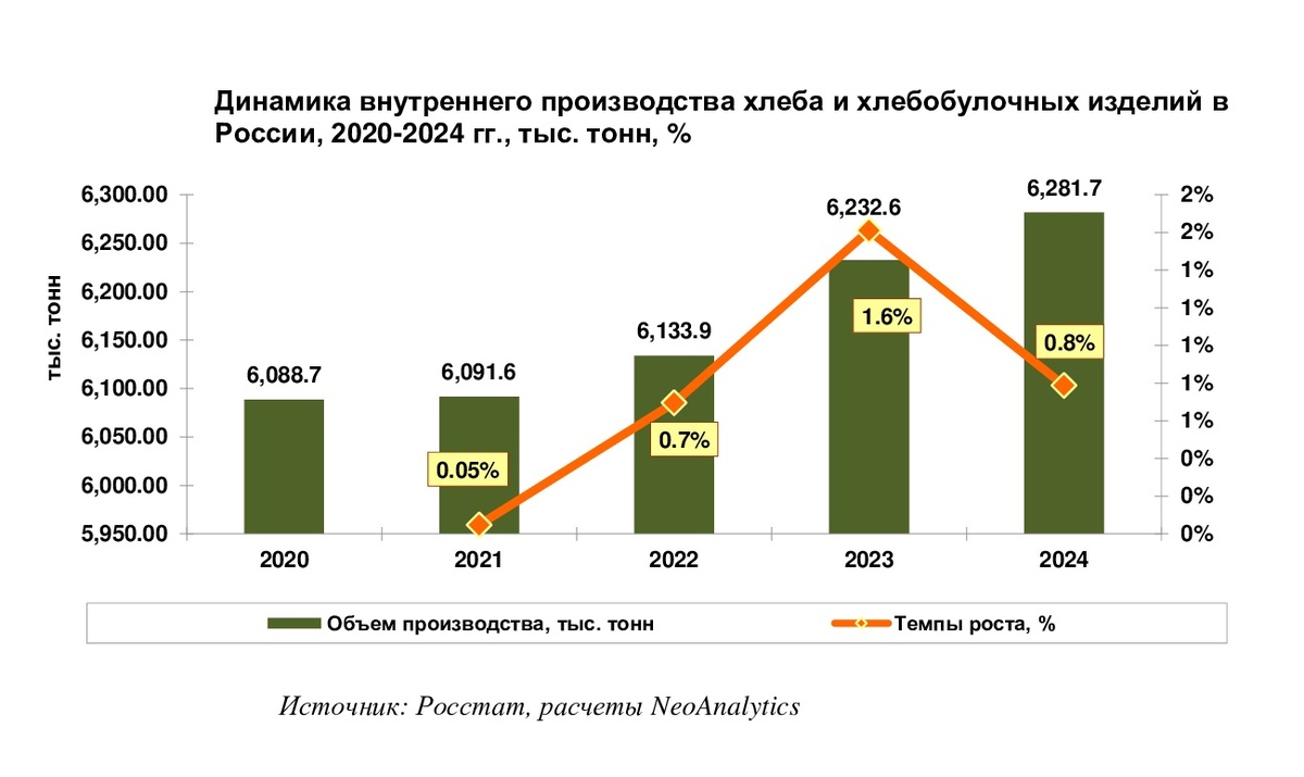 В ходе исследования, проведенного NeoAnalytics на тему «Российский рынок хлеба и хлебобулочных изделий: итоги 2024 г., прогноз до 2028 г.», выяснилось, что по итогам 2024 г. объем производства хлеба и хлебобулочных изделий, включая полуфабрикаты, увеличился на 0,8% по отношению к аналогичному показателю годом ранее и составил 6,3 млн. тонн. В 2024 г. динамика несколько замедлилась. Годом ранее динамика была более интенсивнее и объем вырос до 6,2 млн. тонн. В целом, как показывает статистика, в последние пять лет объем держится на уровне 6–6,3 млн. тонн. В последние годы объем стабильно держится на отметке в 6,2-6,3 млн. тонн. В период 2020-2022 гг. производство составляло 6-6,1 млн. тонн. Сегодня хлеб и хлебобулочные изделия производятся практически во всех регионах России, но присутствует разница в объемах. Таким образом, в общей структуре российского производства хлеба и хлебобулочных изделий в разрезе федеральных округов явным лидером является Центральный федеральный округ, на долю