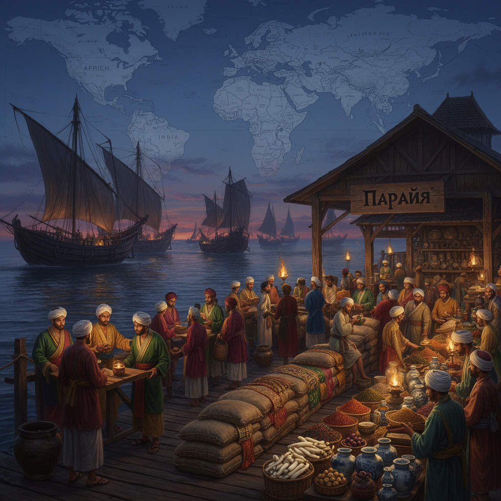 В тени могущественных империй и громких завоеваний разворачивалась другая история — история тихой, но безраздельной экономической власти. Между IX и XIV веками, когда Европа переживала феодальную раздробленность, а миром правили меч и крест, в сердце Индийского океана действовала сила иного рода. Это была не империя в привычном смысле, а могущественная корпорация, сеть, государство в государстве. На яванских и малайских берегах её называли «Парайя». Это слово, звучавшее как имя низшей касты в самой Индии, здесь, в портовых городах Юго-Восточной Азии, означало нечто совершенно иное — «почтенные господа», «повелители торговли».