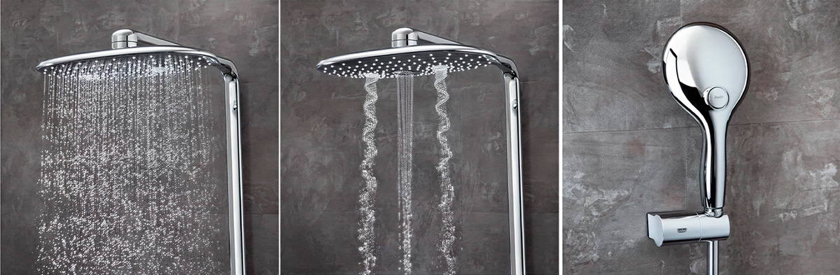 Безопасность для детей: Технология Grohe CoolTouch® делает внешнюю поверхность смесителя всегда прохладной на ощупь. Наслаждение на всех уровнях Верхний дождь: Большая квадратная панель с режимом TrioMassage подарит вам уникальный массаж — комбинацию динамичных и пульсирующих струй для расслабления гол