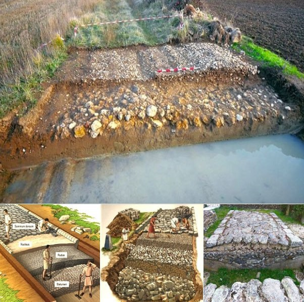 Уровень развития древнеримской дорожной сети поражает воображение: к наступлению эпохи поздней империи в 113 провинциях насчитывалось не меньше 370 крупных дорог, а общая протяженность транспортных артерий, связывавших города огромного государства, составляла около 400 тысяч километров. 📍 Ну а теперь заглянем «внутрь» — в слои римских дорог (на примере дороги в Помпеи): 1️⃣ Почва. Выровнена и утоптана. 2️⃣ Большие грубые камни, стратегически расположенные для облегчения отвода воды. Этот важнейший слой толщиной от 30 до 60 см обеспечивал стабильность и прочность дороги. 3️⃣ Бутовый камень, цемент, глина — толщина 20 см, из дробленых камней диаметром около 5 см, смешанных с раствором. Этот слой придавал дорожной структуре упругость и связность. 4️⃣ Бетонная смесь, включающая гравий, известь, песок и пуццолану. Толщина этого слоя составляла около 30 см, он служил прочным ядром, повышая износостойкость дороги. 5️⃣ Выпуклая поверхность из тесанных камней, силекса или базальта, каменн