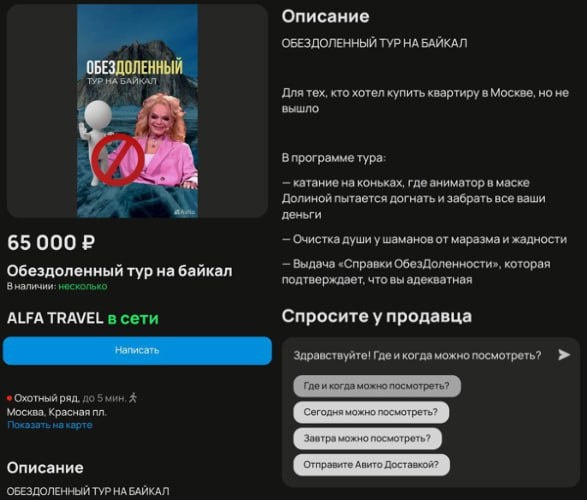 Хайпить на Ларисе Долиной - уже тренд. Теперь вот появились и туры на Байкал для «Обездоленных» - тех, кто хотел купить квартиру в столице, но что-то пошло не так. За 65 тыс. руб. обещают догоняющего аниматора в маске певицы, шаманскую очистку души от жадности и справку о том, что вы адекватны. @tourdom