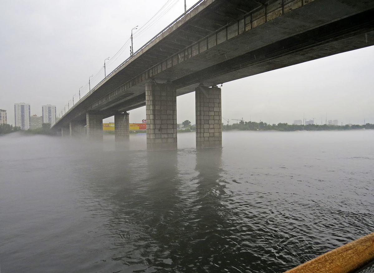 Ниже центра Красноярска над енисейским теплоходом проплывает бывший Октябрьский мост (1977-87), с 2019 официально (местные так не говорят) Мост имени Павла Федирко, местного руководителя-"отца" в 1972-87 годах: добрая половина объектов, которые видно с реки, строились под его началом. По факту это два моста длиной 900 и 300 метров - по левому борту он уходит на остров Татышев и за ним пересекает протоку: Впереди встают трубы самой мощной в Красноярске (481 МВт) ТЭЦ-1, постепенно разрастающейся с 1936 года. В том числе и в 21 веке: её задымившая в 2020 году труба высотой 275 метров считается высочайшей из построенных со времён распада СССР. Издали хорошо видно, что её основание шире многоэтажных домов: За Татышевом вдоль Енисея на 4 с лишним километра тянется коса Феофаниха, доступная лишь по воде, а за ней и Качинской протокой раскинулся на левом берегу жилмассив Зелёная Роща, построенный в 1960-70-х для рабочих алюминиевых заводов: За поворотом встаёт над туманом следующий Коркинс