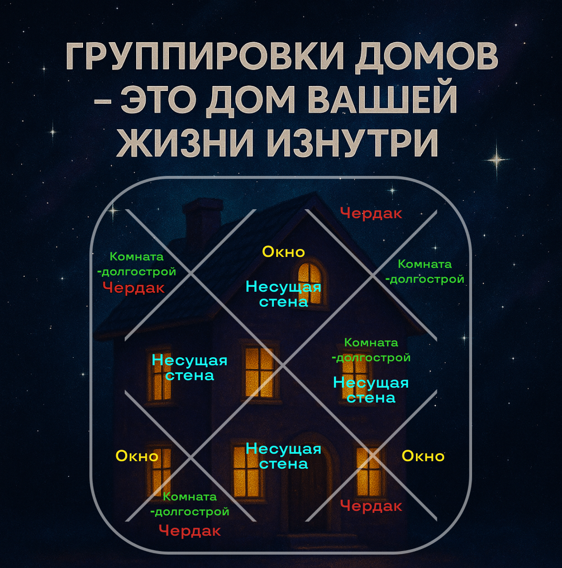 Группировки домов — это дом вашей жизни изнутри Если представить ваш гороскоп как большой дом, построенный из опыта, характера, памяти и выбора, то группировки домов в джйотиш становятся не набором терминов, а вполне узнаваемыми комнатами, в которых вы живёте. Большинство людей впервые задумывается об этом только тогда, когда вдруг замечает, что какие-то сферы у них всегда получаются легче, какие-то требуют десятилетий усилий, какие-то дарят вдохновение, а какие-то заставляют расти через силу. И это не случайность. Это архитектура вашей карты. И давайте, наконец, зайдём в этот дом и разберёмся, что там где стоит. 🟧 Кендры (1,4,7,10 дома) — несущие стены, на которых держится всё Это ваш фундамент, та часть дома, которая остаётся прочной даже тогда, когда вокруг идёт ремонт, сквозняки или внезапное вторжение жизни с сюрпризами. Кендры — это ощущение «Я стою. Я могу опереться. Я знаю свои точки устойчивости». У кого кендры сильные, дом стоит ровно, то и человека не шатает от каждого вне