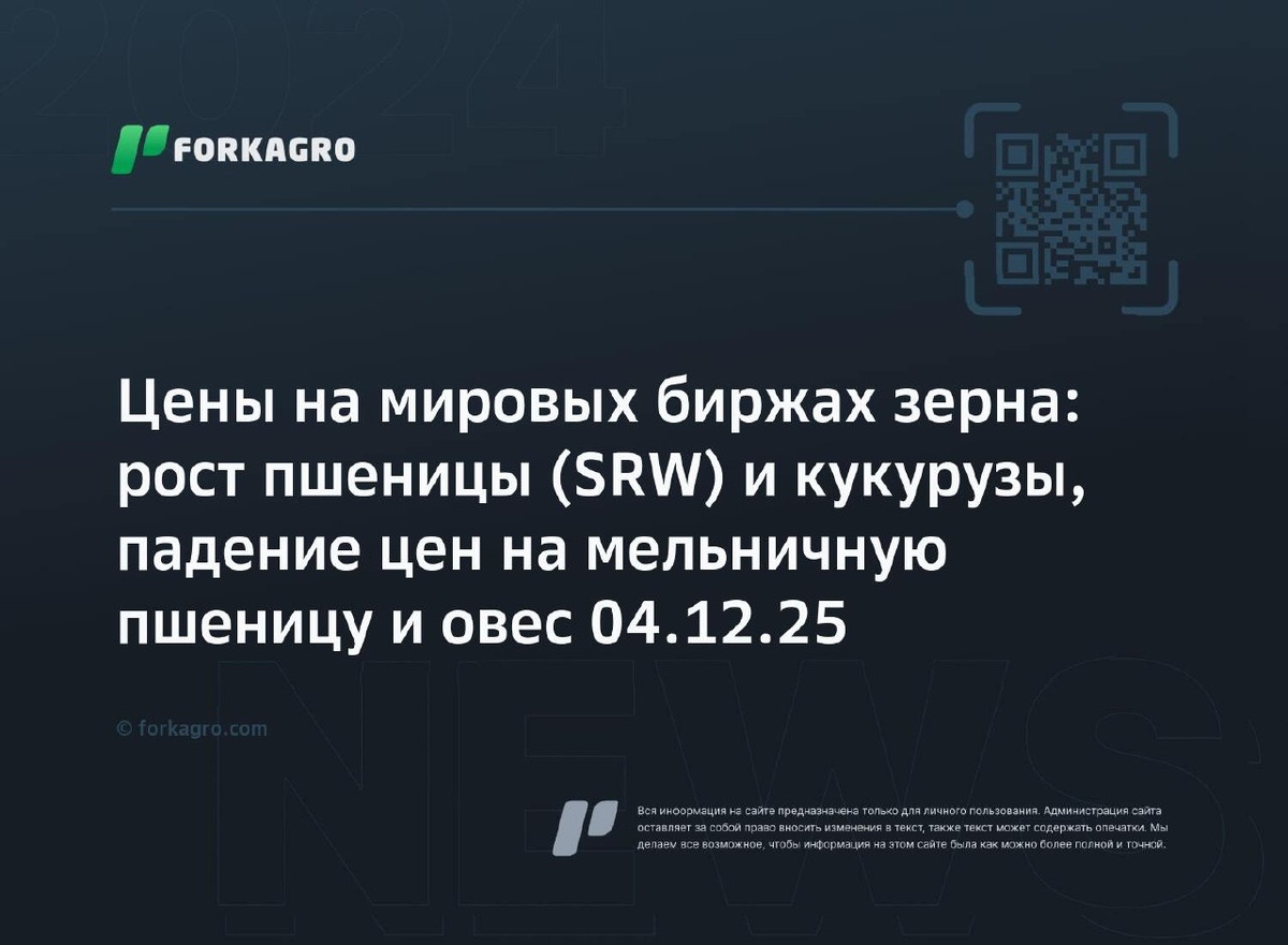 Цены на мировых биржах зерна: рост пшеницы (SRW) и кукурузы, падение цен на мельничную пшеницу и овес 04.12.25