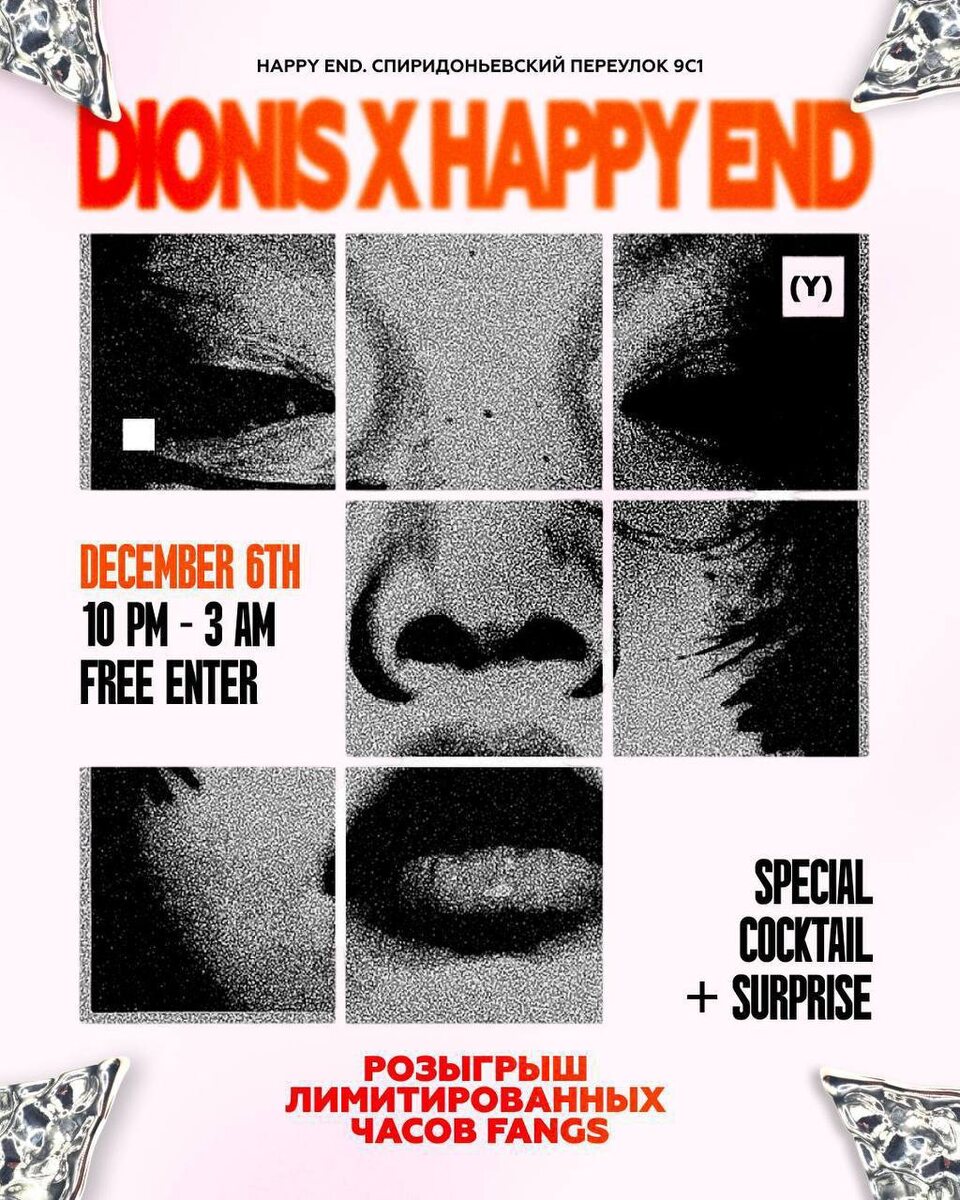 6 декабря — HAPPY END x DIONIS 🪩 Брутальная вечеринка с брендом ювелирных украшений нового формата - @dionisjewelry, который создает кольца, цепи и часы из серебра 22:00-03:00 — PARTY TIME SPECIAL COCKTAIL — при заказе коллаборационного коктейля каждый гость получает сертификат на 3000 на покупку украшений в DIONIS А в кульминацию ночи ребята разыграют легенду бренда — часы FANGS с кварцевым механизмом и черным циферблатом. Подробности в тгк @happyendmsc 🎫 Вход свободный FC/DC 18+