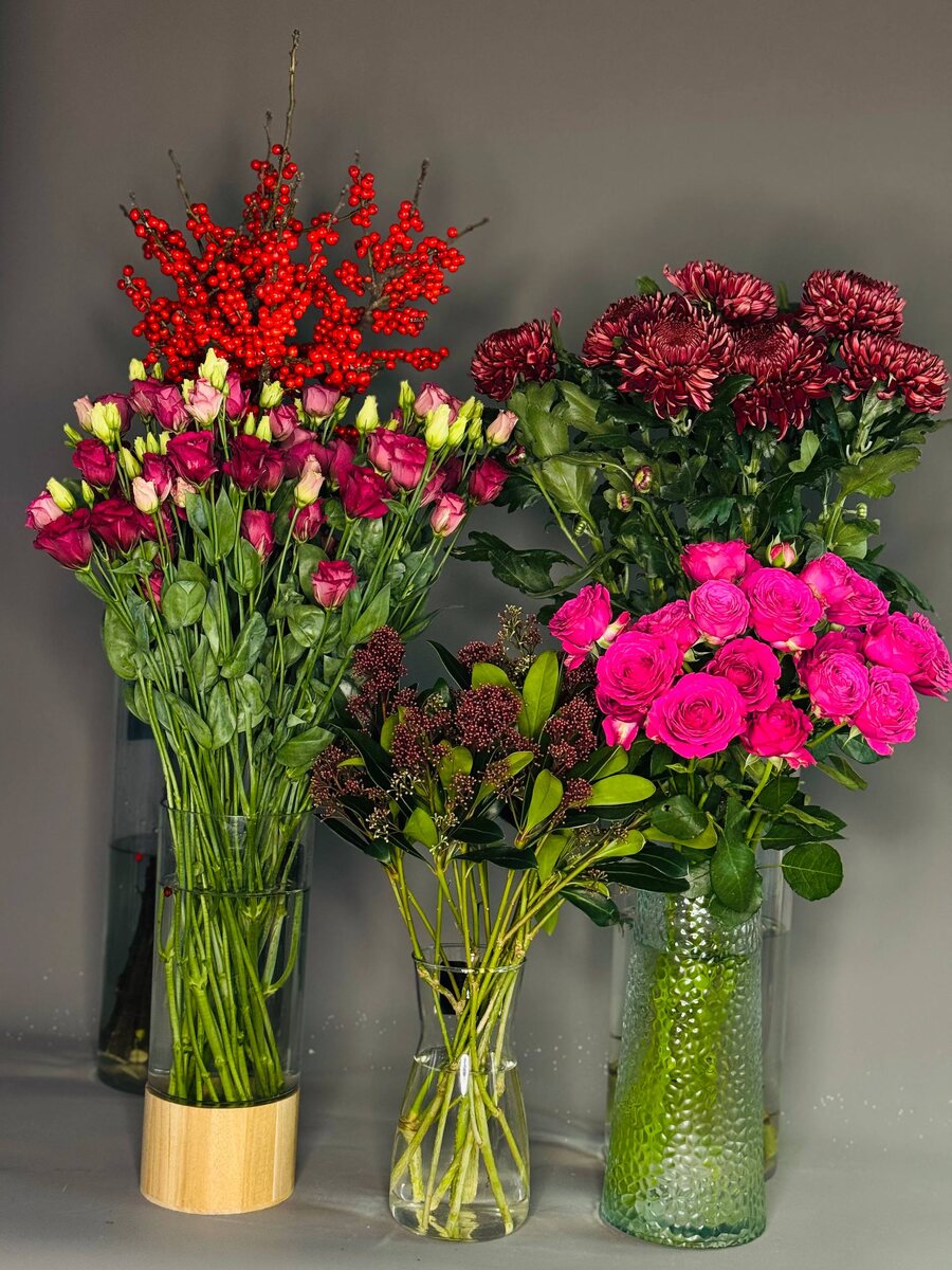 Цветы в вазах — это всегда больше, чем просто декор. Это простая красота, которая наполняет пространство жизнью. В этих композициях — своя история. 🔴 Красные ягоды Илекса Сочные, яркие, словно маленькие искры. Они не требуют сложных форм — просто ветви в вазе, но сколько в них энергии! 🌸 Розовые и бордовые эустомы Нежные, бархатные, изысканные. Они стоят легко, воздушно, создают ощущение мягкости и спокойствия. 🌺 Бордовые хризантемы Бигуди Объёмные, роскошные, словно замедленный взрыв цвета. 🌷 Малиновые кустовые розы Жизнерадостные, яркие, эмоциональные. Они наполняют пространство радостью и свежестью. 🌿 Скандик-ветви скимии с мелкими бордовыми бутонами Спокойная зелень и миниатюрные ягодки создают баланс — их простота подчёркивает красоту соседних цветов.