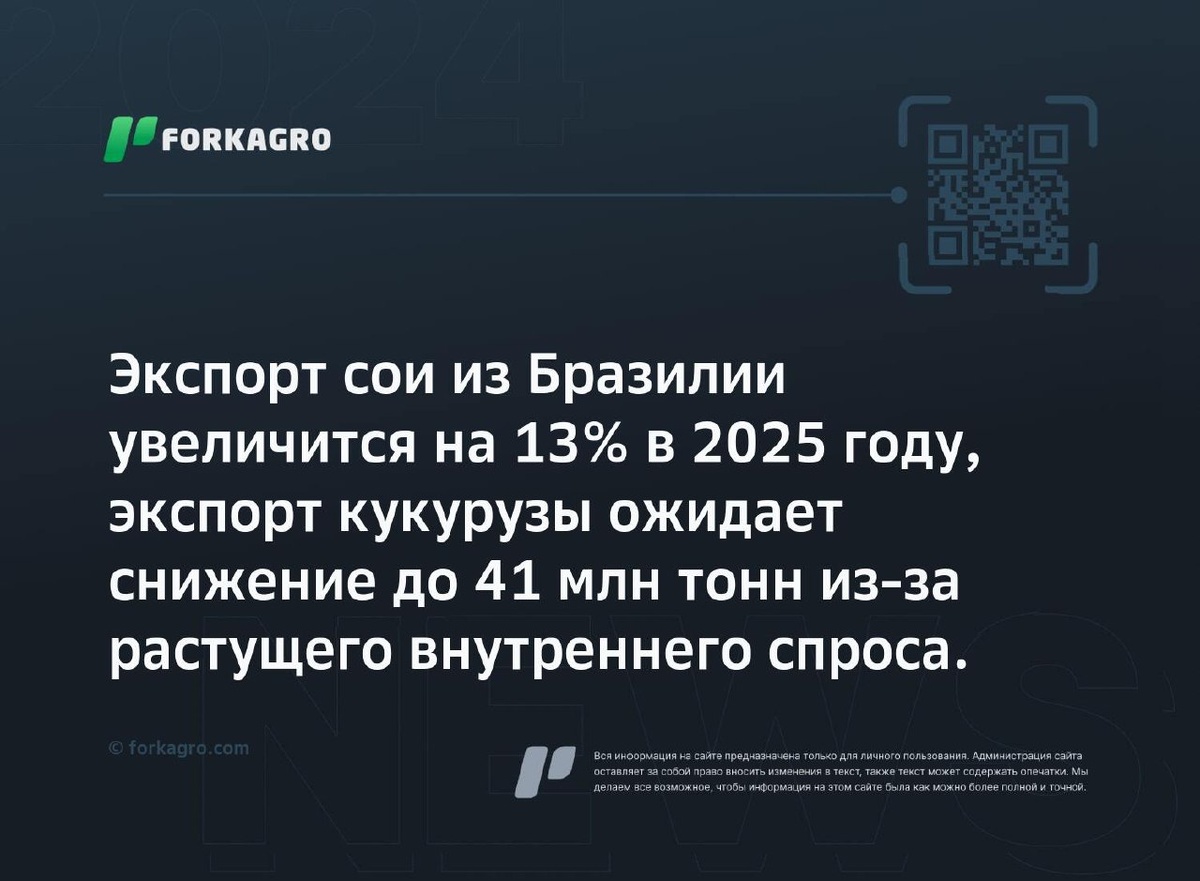 Экспорт сои из Бразилии увеличится на 13% в 2025 году, экспорт кукурузы ожидает снижение до 41 млн тонн из-за растущего внутреннего спроса