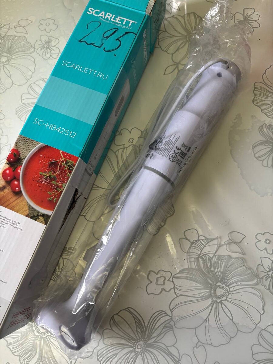 Делюсь своим впечатлением о погружном блендере Scarlett SC-HB42S12, который купила пару недель назад. Искала что-то недорогое, простое, без миллиона ненужных насадок, просто, чтобы быстро взбить суп, сделать соус или смузи. Этот блендер оказался именно таким, ничего лишнего, но работает отлично. Первое, что понравилось, очень легкий и компактный. Рука не устаёт, даже если долго держать. Дизайн приятный, белый, выглядит аккуратно и впишется в любую кухню. Кнопка одна, и мне этого вполне хватает. Нажал - работает, отпустил - выключился. Всё максимально просто и интуитивно. Мощности 500 Вт оказалось достаточно для всех моих задач. Делала им пюре из овощей, отлично справился без комков. Также пробовала измельчать орехи, получилось конечно, не в муку, но до мелких кусочков вполне нормально. Для смузи с бананом и ягодами просто идеально, консистенция получается однородная, без кусочков. Хорошо, что у блендера нож из нержавеющей стали, чувствуется, что качественный: острый, не тупится, н