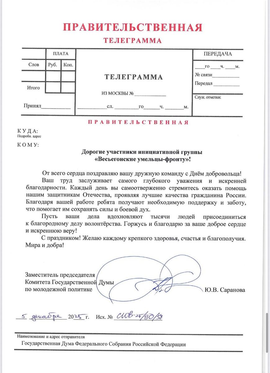 Поздравление с Днем добровольца от руководителя тверского штаба «МыВместе», депутата Госдумы РФ Сарановой Юлии Владимировны Поздравляем наших весьегонских коллег! 🇷🇺 Вместе - победим!