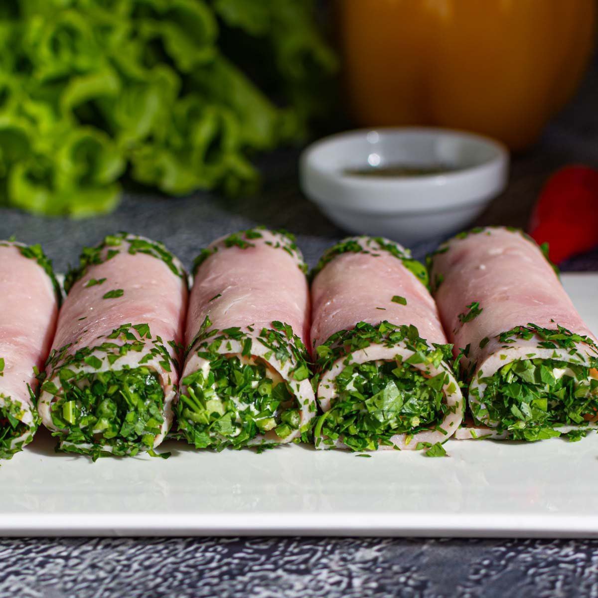 Эти аппетитные рулетики из ветчины – настоящее спасение накануне торжеств, когда время ограничено, а хочется удивить гостей привлекательной, вкусной и по-домашнему сытной закуской. Процесс приготовления занимает считанные минуты: достаточно приготовить нежную начинку из сыра и элегантно завернуть в ломтики ветчины. Они выглядят празднично и украсят как новогодний стол, так и обычный семейный ужин. Натрите на мелкой терке 120 г твердого сыра, добавьте измельченные 2 зубчика чеснока и 3 столовые ложки майонеза. Перемешайте до получения густой массы. Для придания более нежного вкуса добавьте 1 ст. л. сливочного сыра – он сделает консистенцию более стабильной и воздушной. По желанию добавьте мелко нарезанный укроп. Разложите 8–10 тонких слайсов ветчины на рабочей поверхности, распределите по ним начинку и аккуратно сверните в плотные рулетики. Кончики можно зафиксировать зубочистками. Рекомендуем охладить готовое блюдо в холодильнике в течение 10 минут, чтобы рулетики лучше держали ф