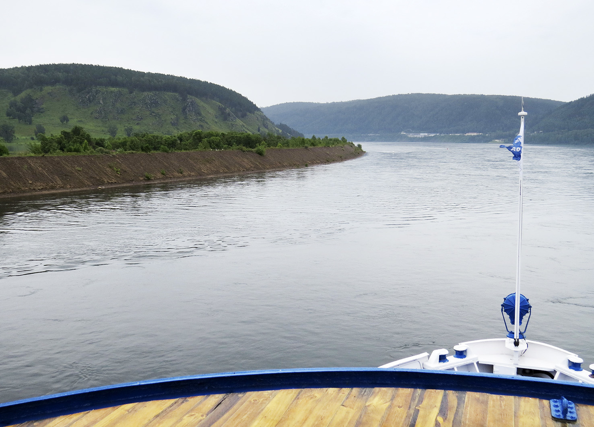 Напротив секретного Железногорска фарватер Енисея жмётся к острову Осерёдыш: По его косе за теплоходом красиво скользит волна: Огибаем Шиверский кряж: Где меня ждало, пожалуй, самое досадное упущение всего речного вояжа - видите у воды фигуру женщины в красном?! Это Барыня, героиня многочисленных очень грустных легенд, но на самом деле её нарисовал лишь в 1920 году некий Василий Беляев из ближайшей деревни Шивера. Нарисовал не просто так: тот странный фарватер позади определили Шиверские перекаты - длинная мель, судоходству доставлявшие проблемы не столь эффектно, как Казачинский порог, но серьёзно. Рисунок - на самом деле водомер, и старые речники знали "Ноги Барыни сухие - дела плохие", а потому вот уже больше ста лет её регулярно поновляют, порой перерисовывая по актуальной моде - сейчас этим занимается разъездной катер "Фаддей Цыганков". Вот только адресована Барыня тем, кто идёт по Енисею вверх, а потому с нашего пути еле заметна. Я честно высматривал её, но, располагая 50-кр