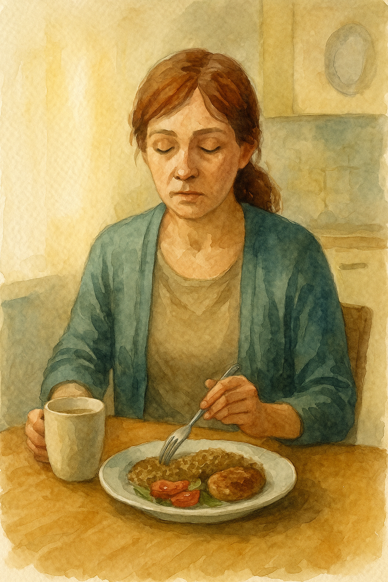 Вилка тонула в гречке, котлета слегка остывала, но всё равно оставалась мягкой. Я почувствовала, как с каждым прожёванным кусочком напряжение в плечах отступает на пару миллиметров, как будто кто-то осторожно снимает с меня тяжёлое пальто, которое я не снимала много зим подряд.