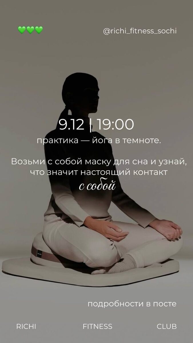 🖤 Йога в темноте 9.12 | 19:00 — практика для тех, кто хочет услышать себя по-настоящему. Без света. Без зеркал. Без внешних отвлечений. Только дыхание, тело и внутренний диалог. 🌙 Что даёт практика: — глубокое расслабление и снижение тревожности; — развитие чувства баланса и телесного интеллекта; — погружение в медитацию и осознанность. 💚 Важно: возьми с собой маску для сна — она поможет полностью отключиться от внешнего мира. ⚠️ Не рекомендуется при сильной тревожности, клаустрофобии и проблемах с координацией. 🧘 Попробуй новую грань практики — йогу в темноте в RICHI FITNESS CLUB.