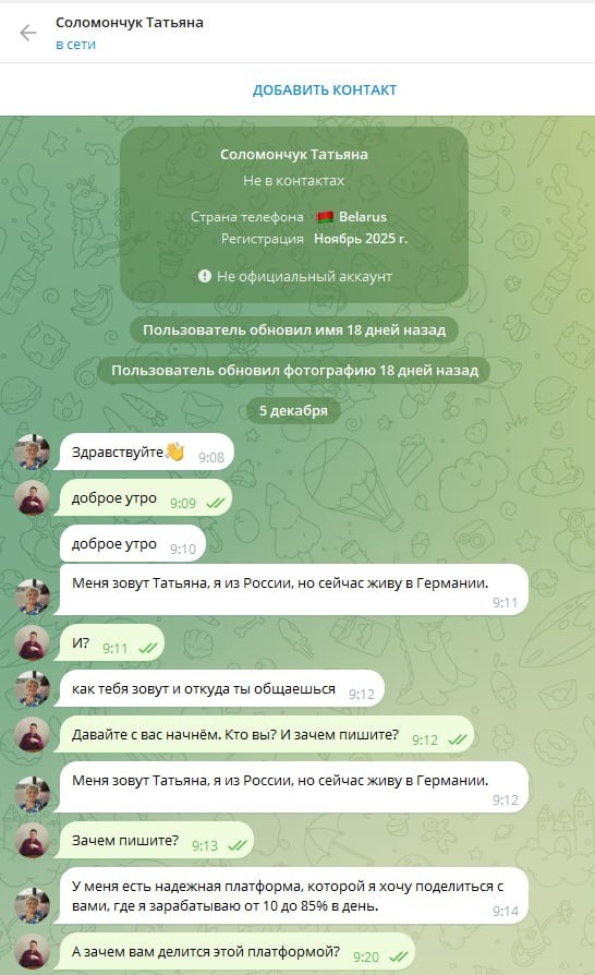Украинский недоумок мужского пола по имени Татьяна, обновивший своё имя 18 дней назад, решил провести отпуск в Белоруссии, но перед этим первому встречному раскрывает секретный способ зарабатывания от 10 до 85 % в день. Наглядный пример того, почему СВО должно быть доведено до конца.