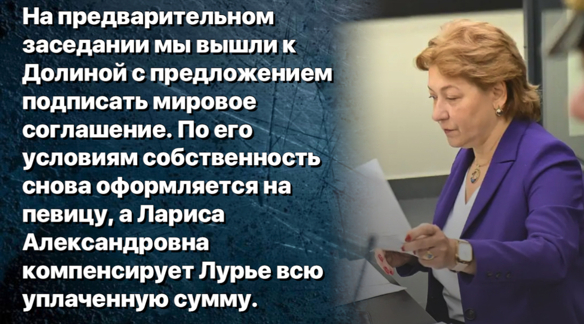 В попытке урегулировать конфликт без судебных разбирательств Полина Лурье, приобретшая апартаменты у знаменитой певицы Ларисы Долиной, выдвинула артистке компромиссное предложение: она готова была вернуть недвижимость прежней владелице при условии возмещения финансовой суммы в размере 112 миллионов рублей. Вот, что рассказала адвокат покупательницы Светлана Свириденко.