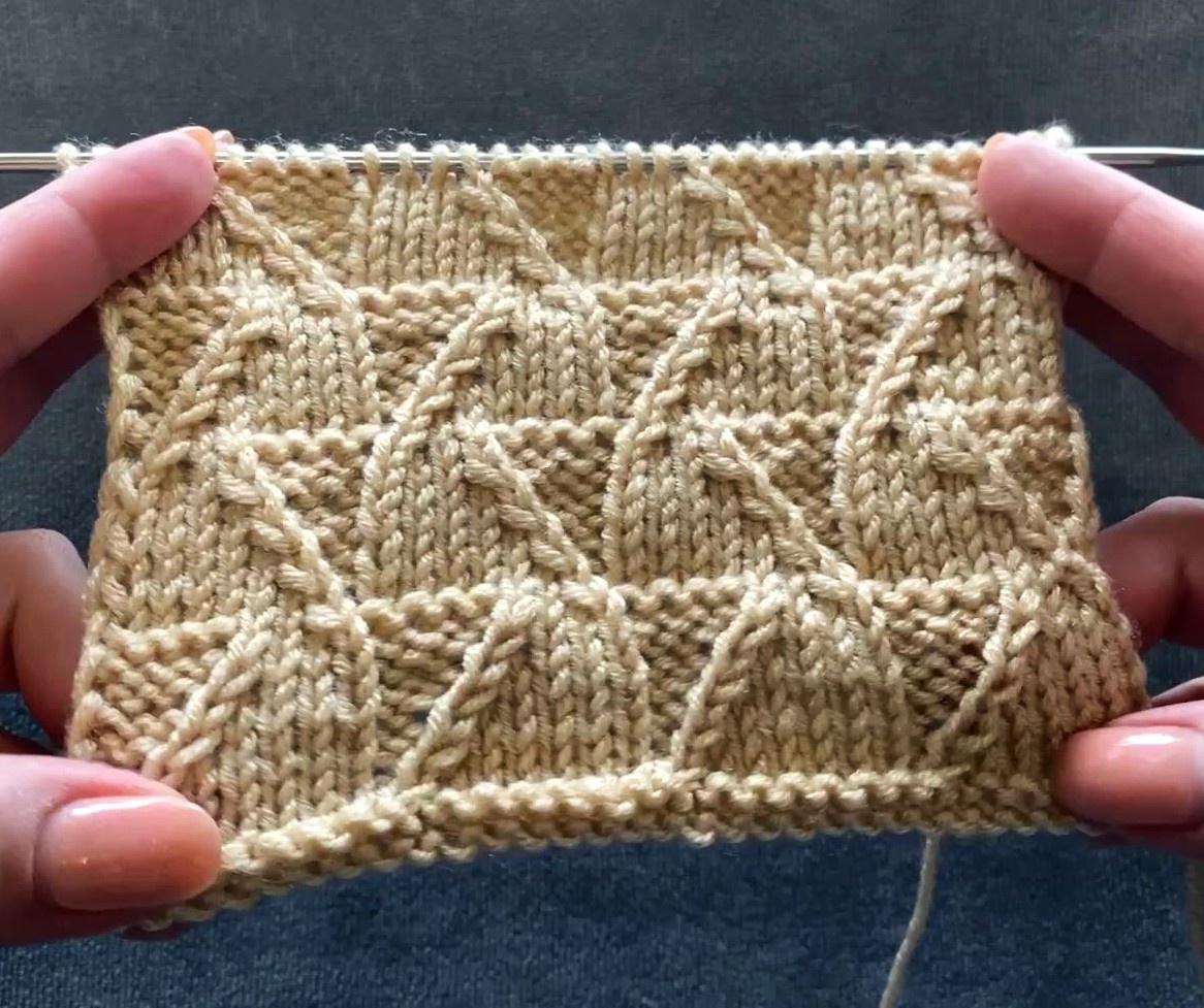 15р: К-К-*3изн-2п перекрестить влево (1-ую петлю провязать изнаночной, 2-ую лицевой)-3л*-К