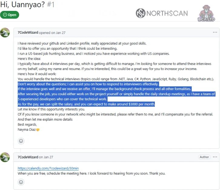 #news Исследователи заманили северокорейского рекрутера в ханипот. Товарищ из Лучшей Кореи отвечает за рекрутинг айтишников из западных стран, чтобы те сдавали свои идентичности в аренду, под которыми затем работают IT-солдаты. Подопытный, конечно, интересный. По GitHub и другим ресурсам идёт спам с предложением заработать участием в собеседованиях, пример на скрине. За этим стоит рекрутинг в подставные лица Lazarus и компании: соучастники сдают в аренду свои ID, банковские счета и доступ к устройствам. Рекрутер попал на камеру, а затем и в ханипот, в котором за ним наблюдали в естественной среде обитания. Попутно крашили песочницы, отключали бедолаге интернет и закидывали его в часовые лупы по решению капчи — в общем, развлекались и оттягивали неизбежное как могли. Всё это записали и закинули в отчёт. По итогам у нас редкий инсайд в работу северокорейских IT-братушек. При этом никаких “Молодец, рядовой! В твоём лице я ясно читаю дух Чучхе!” Обычный корейский айтишник. @tomhunter