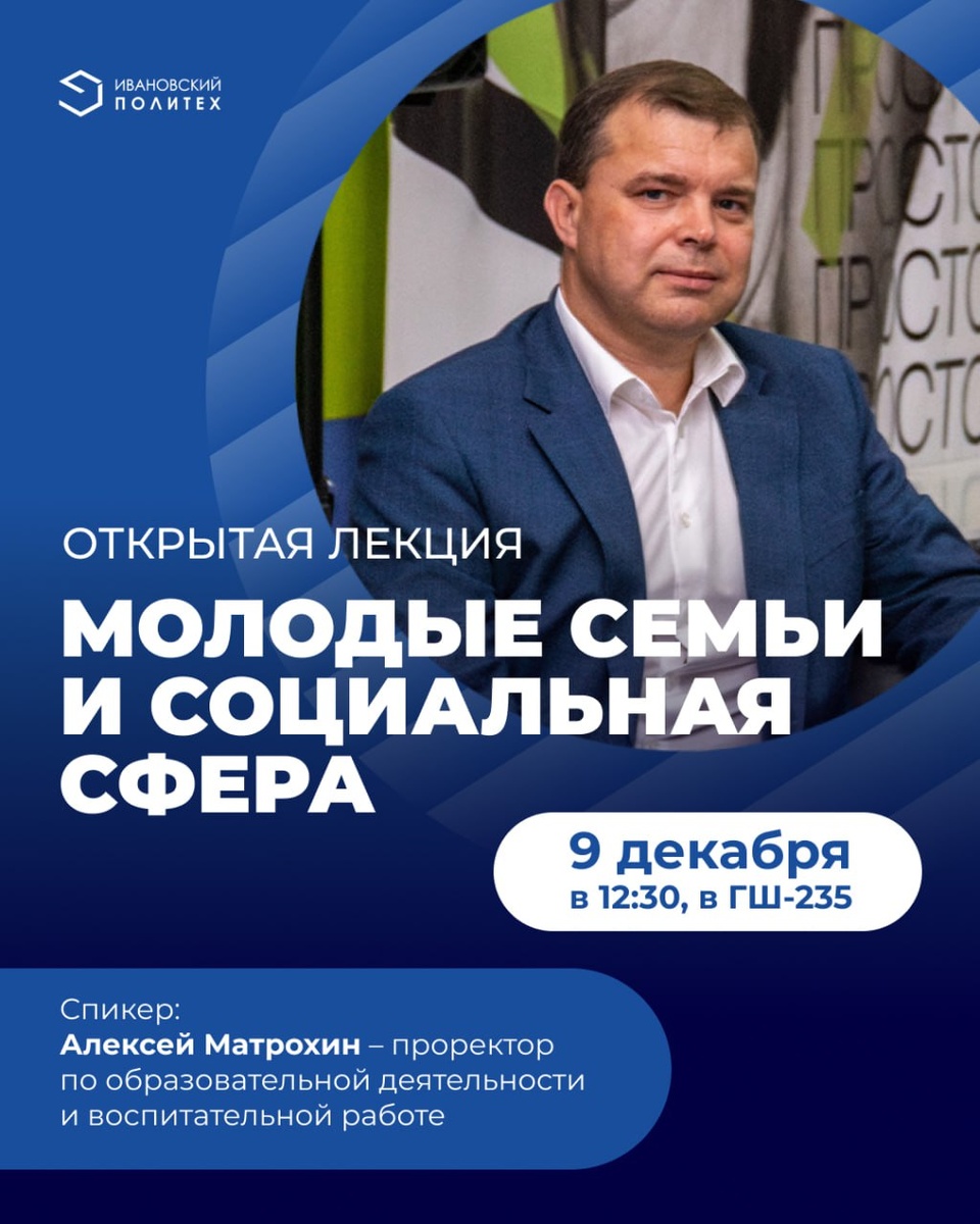 Открытая лекция 🗓 9 декабря, 12:30 📍 ИВГПУ, ГШ-235 Тема «Молодые семьи и социальная сфера» Основные вопросы: 🔵О государственной семейной политике, сохранении традиционных семейных ценностей и повышении роли семьи в жизни молодежи 🔵Опыт ИВГПУ реализации проекта «Твоя семья», неоднократно поддержанного Федеральным агентством по делам молодежи – Росмолодёжь Спикер: Алексей Матрохин – проректор по образовательной деятельности и воспитательной работе 💬 Для справки: Ивановский Политех стал финалистом Всероссийского конкурса команд вузов по молодежной политике и воспитательной деятельности от Российского общества «Знание» (номинация: «Молодые семьи и социальная сфера»). Конкурс проводится совместно с Министерством науки и высшего образования Российской Федерации при поддержке Росмолодёжи. Финальная защита проектов состоится 16 декабря в Москве. За победу в финале борются 143 команды, представляющие 136 учебных заведений из 58 регионов России. 👻 ИВГПУ в MAX | 📲 ИВГПУ в ВК
