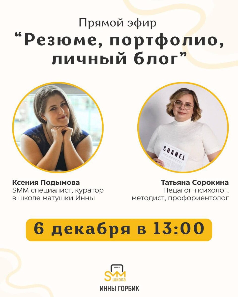 ✨Завтра в 13:00 психолог Татьяна Сорокина и куратор Ксения проведут прямой эфир на тему: «Резюме, портфолио, личный блог