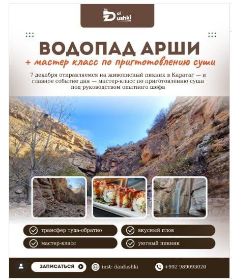 7 декабря, вс - Пикник у водопада Арши (Каратаг) 🕔 08:00 - 18:00 🥾 Сложность: 4/10 💳 250 сомони ✅ Включено: транспорт, гид, плов и мастер класс по приготовлению суши Ждите подробности о каждой поездке! 😍 ☎️ для записи 989093020 или @daidushki_tours☄️