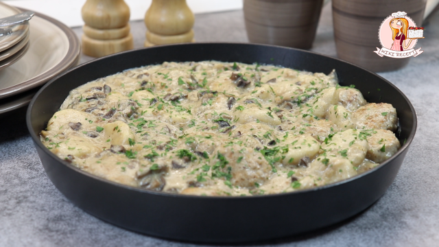 Сегодня готовлю вкусное и сытное блюдо для холодной зимы — фрикадельки с картофельными клецками в сливочном соусе. Уже показывала рецепт картофельных клецек (ньокков), а сегодня демонстрирую, как использовать их в новом блюде — с мясными фрикадельками и грибами в сливочном соусе. 1. Нарезаю крупную луковицу небольшим кубиком. Откладываю часть нарезанного лука — она пойдёт в фарш для фрикаделек. Остальной лук буду обжаривать: нагреваю в сковороде растительное масло, выкладываю лук и обжариваю, помешивая, до золотистого цвета. 2. Беру куриный фарш, солю, перчу, добавляю панировочные сухари и русскую горчицу. Тщательно смешиваю ингредиенты. 3. Когда лук обжарится, снимаю его с плиты и даю немного остыть — мне нужно, чтобы он не был слишком горячим перед добавлением в фарш. За это время панировочные сухари в фарше успеют размякнуть. Как только лук немного остынет, добавляю его в фарш и ещё раз всё хорошо перемешиваю. 4. Набираю небольшое количество фарша и формирую фрикадельки. Сегодня
