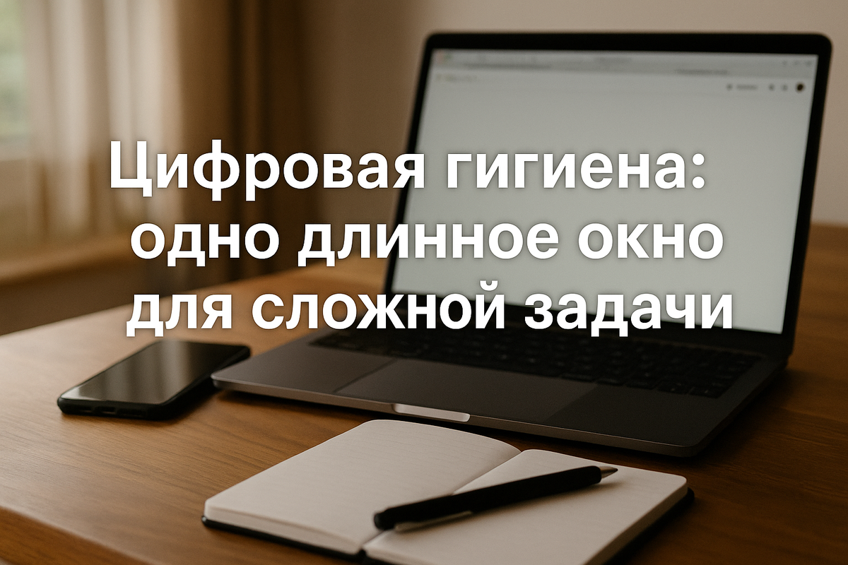 Здесь речь о простой практике цифровой гигиены: два раза в неделю выделять одно длинное «тихое окно» на 40–60 минут, когда вы без связи и заняты только одной сложной задачей. Не каждый день и не по полдня, а всего два устойчивых «острова внимания» в неделю.