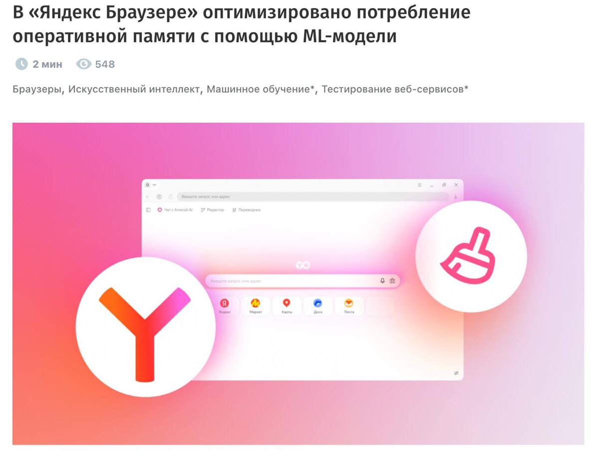 Новость для любителей миллиона открытых вкладок — Яндекс Браузер оптимизировал нагрузку на оперативку и теперь тратит ее меньше, чем Chrome В Браузере появилась ML-модель, которая определяет неактивные вкладки и позволяет освобождать от них оперативную память. По замерам это дает возможность тратить ее на 36% меньше, чем в браузере от Google. Цены на оперативку стали пугать чуточку меньше ❤️ CtrlAltDelights- подписаться
