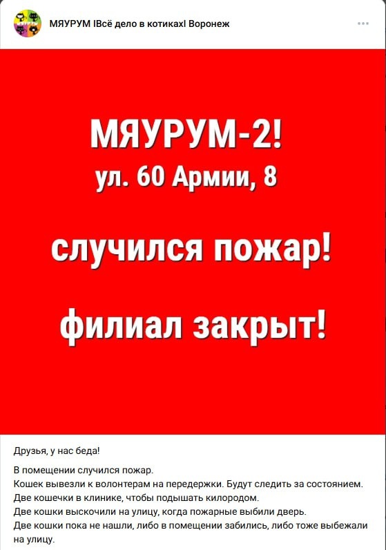В результате пожара в котокафе «Мяурум» на улице 60-й Армии погиб один кот. Пожар начался с возгорания мебели. На момент происшествия в помещении находились 15 животных. Один из них скончался, двое пропали во время эвакуации. Остальные кошки были спасены, однако получили серьезные отравления продуктами горения. Работники заведения выражают надежду на благополучный исход для пострадавших питомцев. Сотрудниками пожарной службы была оперативно проведена эвакуация животных, что позволило минимизировать число жертв. Причина возгорания пока неизвестна. Повреждения здания оцениваются как значительные.