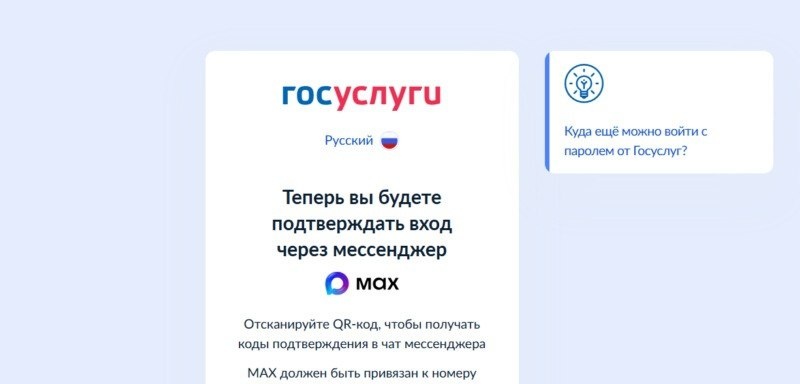 Войти на Госуслуги теперь можно только через MAX При попытке зайти в личный кабинет на портале со смартфона через некоторые браузеры альтернативы для получения кода безопасности через СМС больше нет. Предлагается привязать номер телефона к МАХ и получать коды для входа через национальный мессенджер. Кнопка «пропустить» тоже пропала. При этом с компьютера СМС с кодами безопасности пока что приходят, и кнопка «пропустить» авторизацию через МАХ тоже на месте. Также установки мессенджера МАХ не требует (пока что) мобильное приложение Госуслуги.