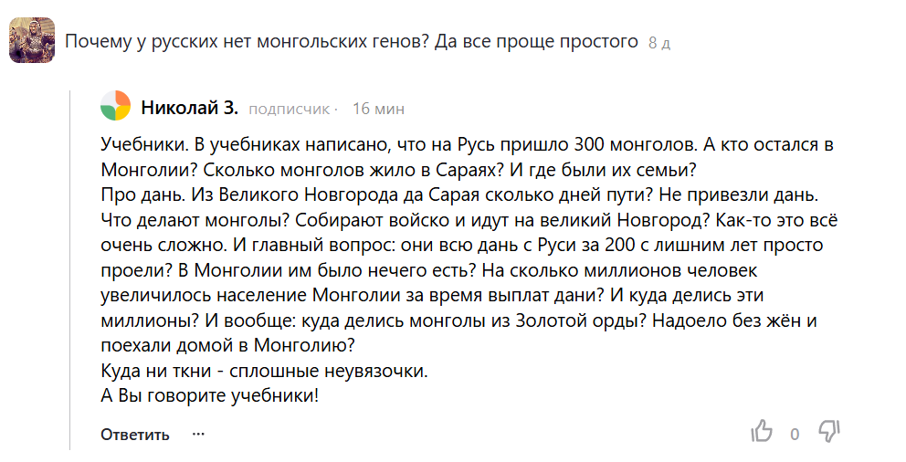 Темы про монголов всегда вызывают какую-то лавину комментариев с однообразными вопросами. Отвечать на каждый такой комментарий даже смысла нет, поскольку он будет быстро погребен под тоннами точно таких же вопросов.