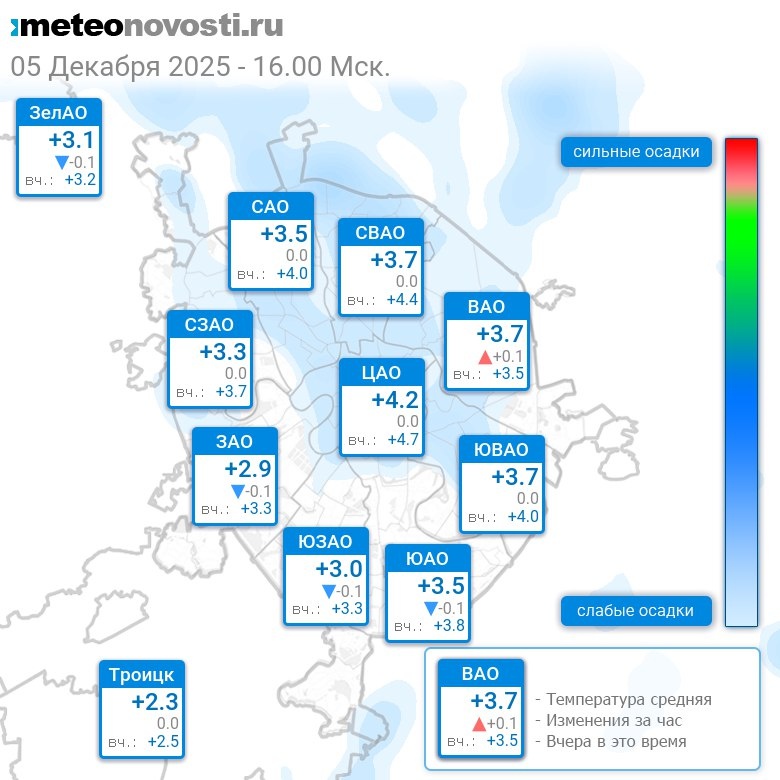 В 16:00 в Москве было от +1.9°C до +4.9°C, средняя температура +3.5°C #погода #Москва #зима #температура #5декабря #пятница