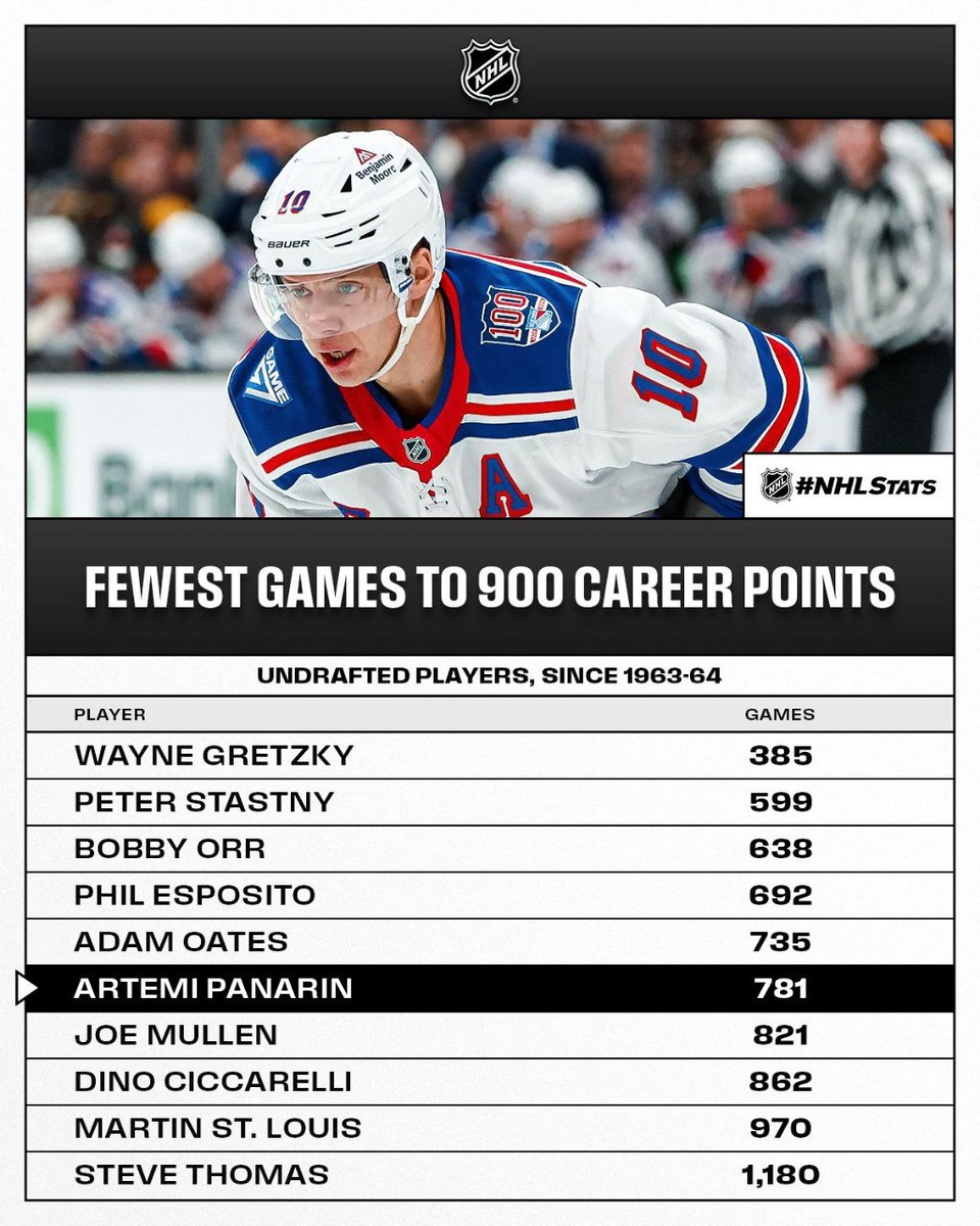 🥅 Артемий Панарин добрался до отметки в 900 очков 781 игра, 900 очков для парня, который не был задрафтован — это очень круто. В комментах давайте умничать о том, какой контракт он получит и в каком клубе. @pro_nhl_ru