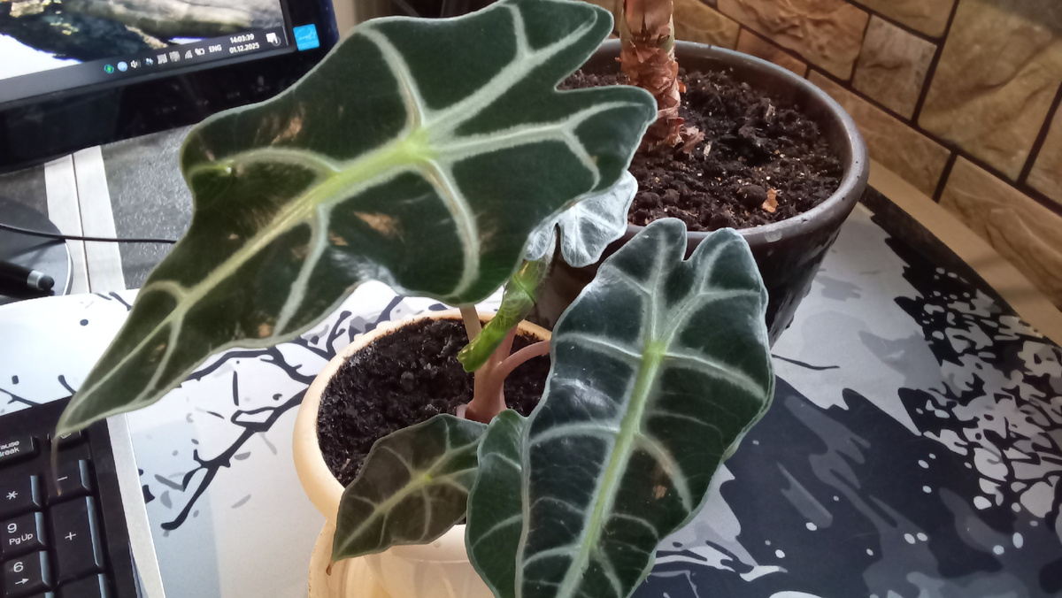 Алоказия Полли - одно из самых красивых декоративно-лиственных растений. Очень красивое растение с крупными, блестящими тёмно зелёными листьями с яркими серебристыми прожилками. Живет эта алоказия у меня уже четыре года, но, к сожалению, эта гостья из тропических лесов оказалась очень капризной. А поскольку почти все тропические растения требуют повышенную влажность воздуха, то из-за сухого воздуха в квартире, листья у алоказии сохнут с космической скоростью. Распускается один листик, а старые тут же засыхают. И никакие ухищрения с увеличением влажности воздуха не помогали: ни частое опрыскивание, ни снижение температуры, ни поддон с влажным керамзитом. А хочется иметь, сами понимаете, красивое здоровое растение. Уже готова была признать, что мои условия совсем не подходят для такого экзотического растения и расстаться с экзотикой. Но помог решить эту проблему его величество случай. Во время пересадки алоказии отвалился клубенек, которыми алоказия размножается. Выбрасывать его б