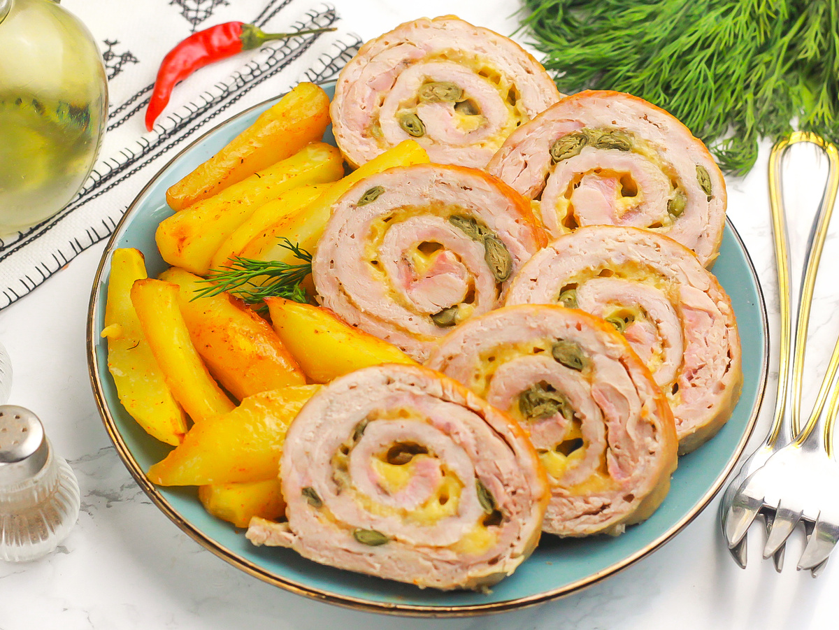 С этим рулетом вы не промахнётесь. Свинина мягкая, сочная, завитки на срезе – как на картинке. Готовим из шеи – она жирная, мясо получается без сухих краёв. Внутри сыр, немного кисленькой начинки. Просто и очень вкусно! Полный список ингредиентов – в конце⤵ Берём 700 г свиной шеи без костей и жил – она мягче и сочнее остальных частей. Промываем, обсушиваем, начинаем «раскрывать книжкой»: сначала надрезаем вдоль, оставляя 1 см до конца, разворачиваем. Потом толстую часть ещё раз надрезаем и снова разворачиваем – получится длинный пласт. Аккуратно отбиваем молотком с двух сторон. Важно: отбить мясо нужно до тонкого слоя, не полениться, и тогда у вас получится красочный рулет со множеством завитков. Солим (0,25 ч.л.), перчим (4 щепотки), можно добавить немного сушёного чеснока или любимых специй. Твёрдый сыр – 120 г – натираем мелко, выкладываем на мясо, но не до краёв. Больше фото смотрите тут: Сверху раскидываем 2 ст.л. каперсов или мелко порезанный солёный огурец (около 1,5 шт). От