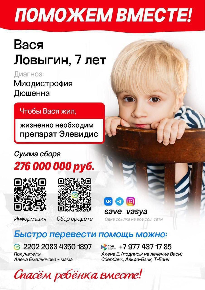 5-й день нашего адвент-календаря! Сегодня мы с ребятами делаем открытки для нашей Коробки Добра И пока дети рисуют, я хочу поделиться тем, мимо чего пройти просто невозможно Вчера мы собирали свою коробку — а вы можете собрать свою. Иногда помощь нужна совсем рядом. И сегодня я хочу рассказать о мальчике, которому действительно важно не остаться без поддержки Вася Ловыгин, 7 лет, Московская область У Васи редкое и тяжёлое генетическое заболевание — миодистрофия Дюшенна Это болезнь, при которой мышцы ребёнка постепенно слабеют и исчезают. Со временем становится сложно ходить, подниматься, потом — дышать и даже глотать. Сердце тоже мышца… и болезнь постепенно поражает её. Сейчас Васе можно помочь: в клинике Medcare Women & Children’s Hospital (ОАЭ, Дубай) готовы сделать инфузию препарата Elevidys. Но сумма на лечение — огромная: 276 млн рублей Самостоятельно семье такую сумму не собрать. Время играет против них — если Вася потеряет способность ходить, препарат уже не сможет подейс