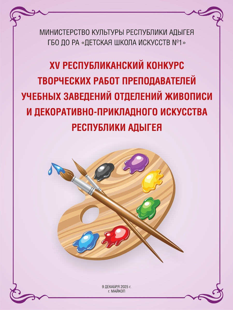 преподавателей учебных заведений отделений живописи и декоративно – прикладного искусства Республики Адыгея, который проводится в рамках Государственной программы Республики Адыгея «Развитие культуры». Конкурс проводится Методическим центром Детской школы искусств №1 при поддержке Министерства культуры Республики Адыгея с целью повышения профессионального уровня преподавателей, реализации накопленного жизненного и профессионального опыта, пропаганды творчества преподавателей и обмена опытом. Подробнее по ссылке 💬Минкульт Адыгеи в МАХ #новости_минкульт_РА #РеспубликаАдыгея #КартиннаягалереяРА #ДШИ #КультураМалойРодины