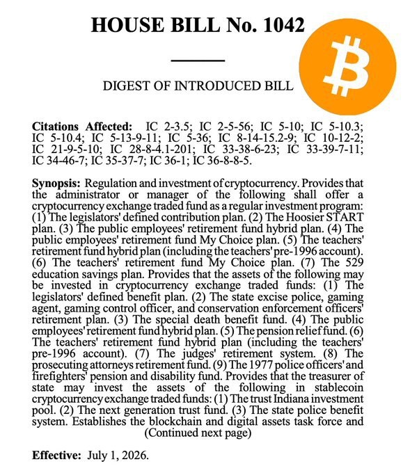 🔸Палата представителей штата Индиана внесла законопроект, разрешающий пенсионным фондам инвестировать в биткоин.