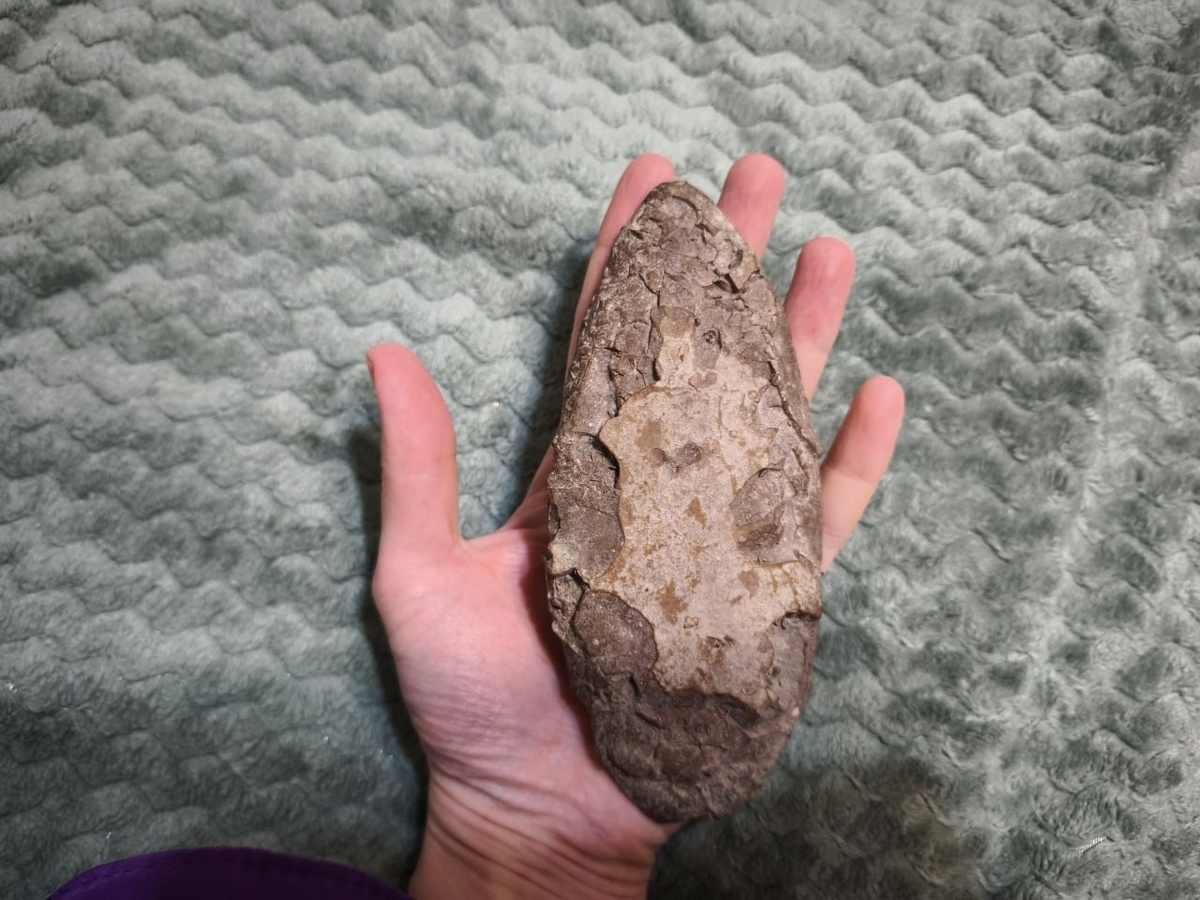 «Судя по симметричной миндалевидной форме, это могло быть изделие, причем даже палеолитического возраста, но оно было повреждено огнем, вся его поверхность сейчас — это поверхность шелушения от слишком сильного нагрева. Еще бы чуть-чуть и от него остались бы только разрозненные осколки, почти пыль. Из-за этих повреждений судить более точно о том, что это на 100% артефакт и тем более о том, какого он времени — не представляется возможным, увы. Так что это почти просто камень. Такова работа с древностями: всё, что когда-то появилось из природного окружения, рано или поздно туда вернется, и мы либо успеваем до момента превращения артефактов обратно в геофакты, либо нет.