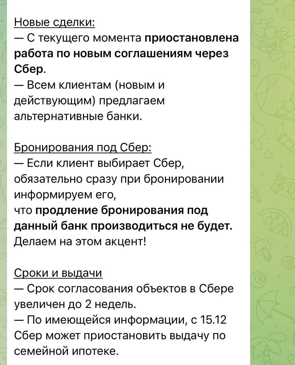 💔А вот и рассылка от застройщиков пришла касаемо Сбера и вчерашних новостей. Странно , что кто-то ждет сообщения в официальных СМИ. Из года в год есть практика , когда банки в какой -то момент принимают документы на ипотеку, не дают никаких одобрений и просто невозможно выйти на сделку. Финансовая структура делает это на свое усмотрение, без огласки , потому что решение выдать вам деньги или нет за ней, а не за кем другим.