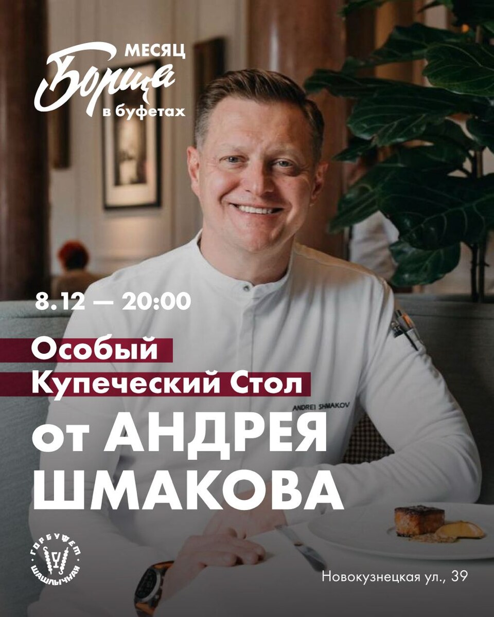 А вот еще отличная новость про Андрея Шмакова – 8 декабря в 8 вечера он будет готовить купеческий стол в Шашлычной на Павелецкой