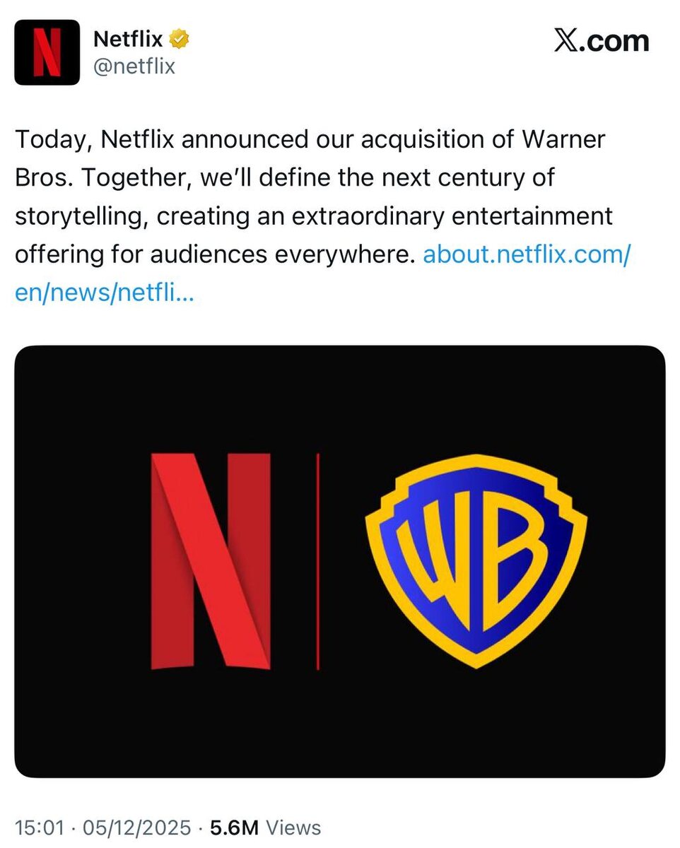 ⚡️Netflix just swallowed Warner Bros for $82.7B Harry Potter, Batman and Superman now report to… A streaming app that’s known for frequent subscription prices hikes, cancelling titles that people liked, and pushing 'inclusivity'