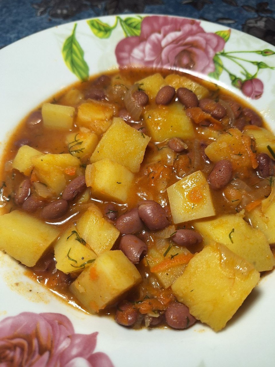 Лук нарезать полукольцами т обжарить на раст.масле до прозрачности. Морковь натереть на крупной терке и переложить к луку, обжаривать 5 минут. Картофель нарезать кубиком , переложить к луку, залить кипятком, добавить соль, перец, сушенный чеснок, лавровый лист, душистый перец и тушить с закрытой крышкой 15 минут. Затем добавить фасоль в томатном соусе и продолжаем тушить еще 15 минут. В конце по желанию можете добавить любую зелень. Приятного аппетита!