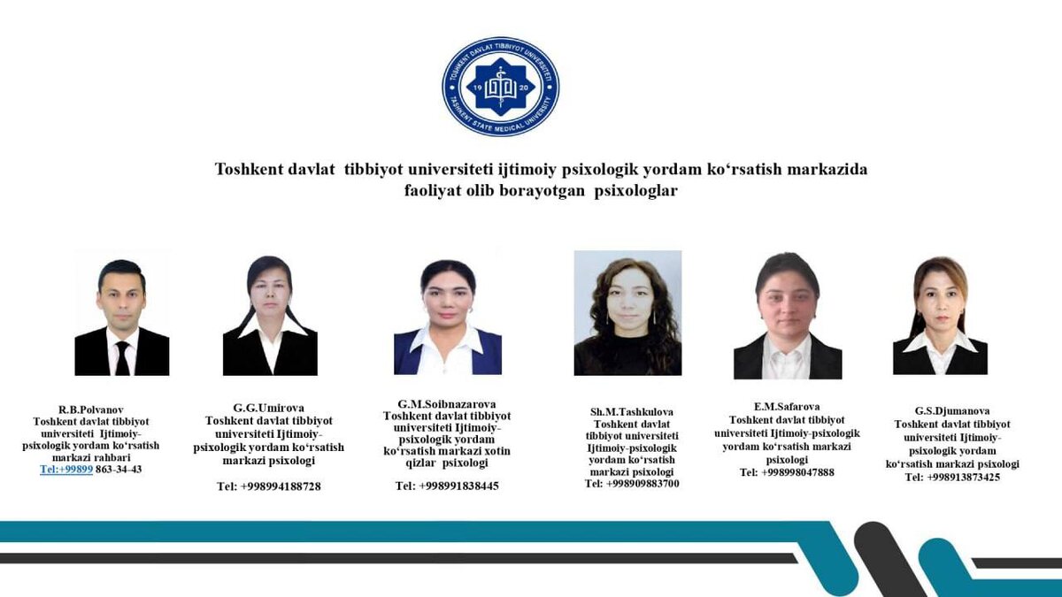 Toshkent davlat tibbiyot universiteti hurmatli professor-o‘qituvchilari va aziz talaba-yoshlari! Sizlarga ma’lumki, universitetimizda Ijtimoiy-psixologik yordam ko‘rsatish markazi faoliyat yuritib kelmoqda. Ushbu markazning tajribali psixologlari sizning ruhiy holatingiz, shaxsiy muammolaringiz, o‘qish jarayonidagi qiyinchiliklar yoki oilaviy-ijtimoiy masalalarda har qanday vaziyatda yordam berishga tayyor. Markaz psixologlari bilan ushbu rasmda ko‘rsatilgan telefon raqamlari orqali bog‘lanishingiz mumkin. Biz doimo siz bilanmiz — sizning ruhiy farovonligingiz biz uchun muhim!