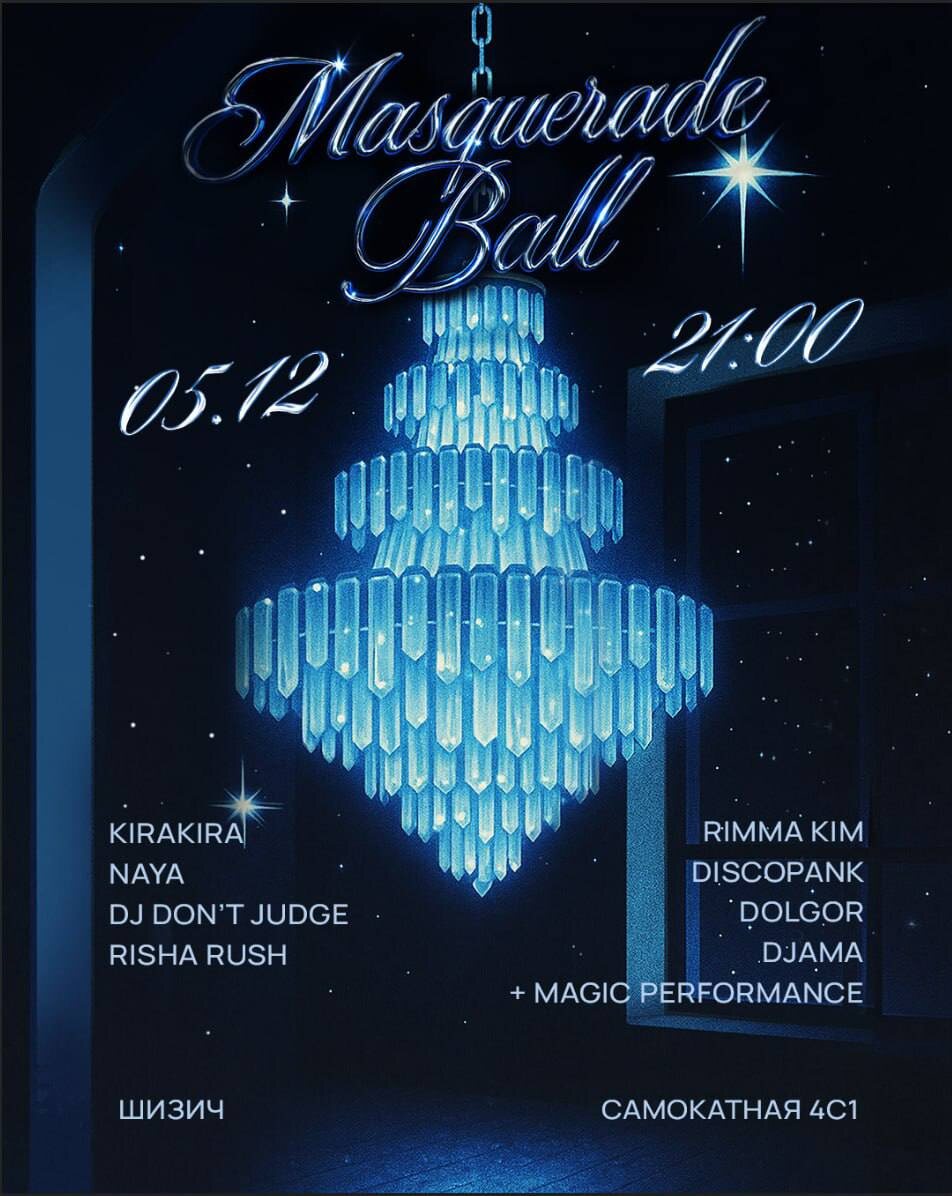 ✨5 Декабря откроются двери предновогоднего бала-маскарада, где каждый – герой нашей таинственной ночи. В этот раз сказка разворачивается в совершенно новых декорациях, в неизведанном месте, в выдуманном мире, где время, кажется, замирает по волшебству. В ваших руках – ключ. Какую дверь вы откроете? Вас ждут: магические перформансы, танцы, любимые активности, визуальное наслаждение и подарки. kirakira ❄️ NAYA ❄️ DJ Don’t Judge ❄️ Risha Rush ❄️ Rimma Kim ❄️ Discopank ❄️ Djama ❄️ Dolgor ❄️ Magic Performance 🎫 Билеты FC: только девушки DC: новогодний маскарад (любой комфортный образ) 📆 5 декабря, в 21:00 📍Шизич, Москва, Самокатная ул. 4с1