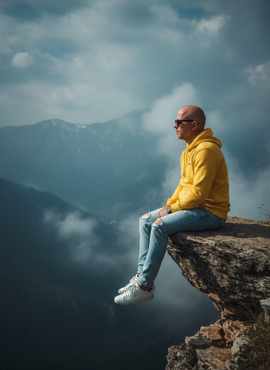 Промт и боты Nano Banana👇👇👇 https://t.me/nanobanana_promt/23 https://dzen.ru/nanobanana_promt Используйте одно и то же лицо. Создайте гиперреалистичный портрет мужчины, сидящего на скале в горах Сочи (для детализации лица использовано 100% эталонное фото) полный снимок мужчины с видом сбоку, сидящего на краю скалистого обрыва. На нем желтая модная толстовка с капюшоном, светло голубые потертые джинсы и белые кроссовки. На фоне густой дымки открывается вид на кавказские горы Сочи, покрытые легкой дымкой, и небо, затянутое облаками.Высококачественная фотография, кинематографичный свет, глубокие тени и яркие блики.