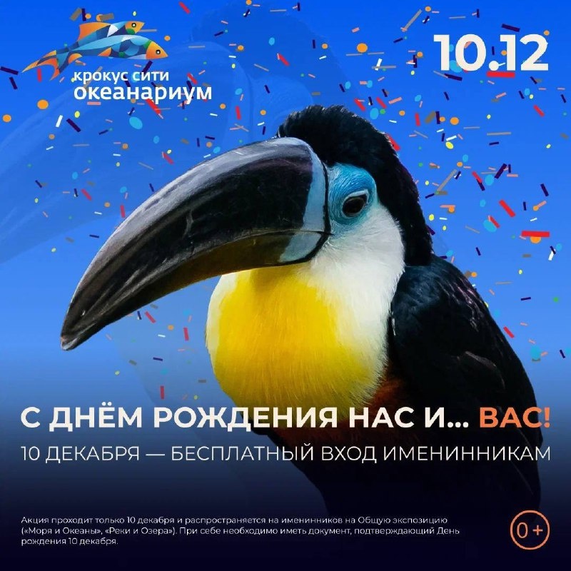 Бесплатный вход для именинников 10 декабря! Девять лет назад 10 декабря 2016 года Крокус Сити Океанариум открыл свои двери для посетителей. Эта дата – наш официальный День рождения🎉 Объявляем акцию! Если вы тоже родились 10 декабря, не упустите возможность побывать в этот день у нас в гостях абсолютно бесплатно. Отпразднуйте свой личный праздник вместе с нами в компании экзотической живности со всего света! Акция проходит только 10 декабря и распространяется на именинников на Общую экспозицию («Моря и Океаны», «Реки и Озера»). При себе необходимо иметь документ, подтверждающий День рождения. Для оформления обращайтесь на стойку информации на первом этаже Крокус Сити Океанариума.